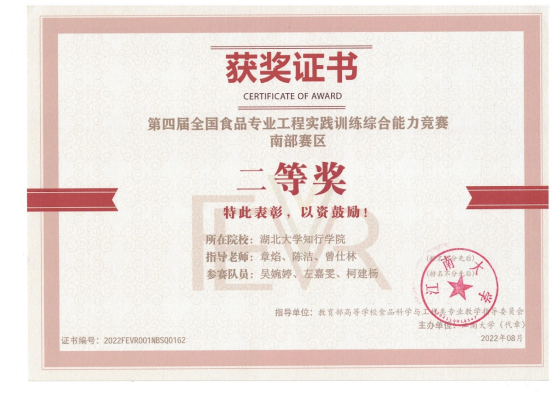学生参加第四届全国食品专业工程实践训练综合能力竞赛获南部赛区二等奖