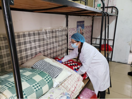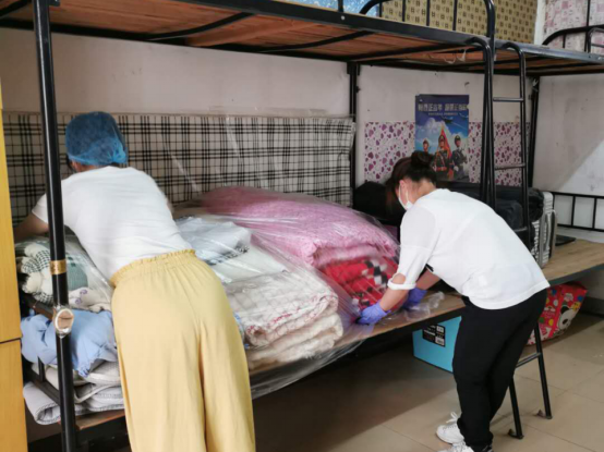 王徽老师和孙美玲老师都是二孩的母亲,小学、幼儿园均没复学,克服两个小孩没人照看的困难,在家中将动画片和零食给准备好,舍小家,顾大家,义无反顾全身心投身寝室复原工作中。