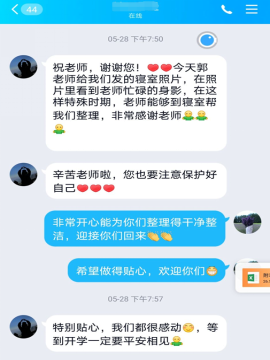 郭雅纯老师,学生的”知心姐姐”。为帮同学找重要的证书,邮寄来来回回很多次。因为这场突如其来的疫情,同学们不能回到学校上课,在学习方面造成了一定的不便,之前购买的书籍都放在学校,向辅导员郭老师反应这个情况后,去宿舍将同学的书寄到家里。同学收到书籍的那一刻,内心充满了感谢与感动。郭老师还是复原工作中的质量担当,当同学看到老师们把寝室收拾的整整齐齐、干干净净的照片,完全没有所担心的情况,顿时感到很安心。寝室的同学们反应在这样的特殊时期,老师们能够冒着生命风险到学校帮忙寄书、整理宿舍,处处为学生考虑,让她们放下心中的顾虑,安心学习,感到学校和老师们都关爱和贴心服务。同学们表示,能够在知行学习、遇到这些老师们,感到很幸运与幸福。希望老师们能够在武汉保护好自己,等到开学大家定要平安相见。