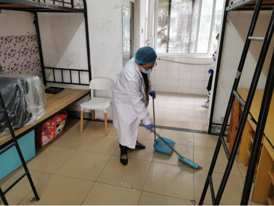 詹靖娴老师整理细小、零碎的物品特别细心仔细。付天老师穿行于武昌和学校之间,疫情面前勇担当,发挥身高的优势主动承担清理天花板、墙壁上的蜘蛛网等脏活累活。汪浩明老师,整理起寝室来一丝不苟,哪里有需要哪里就有汪老师的身影,在完成自身任务后,还积极支援其他小组,保障了整理寝室工作进度的有序推进。
