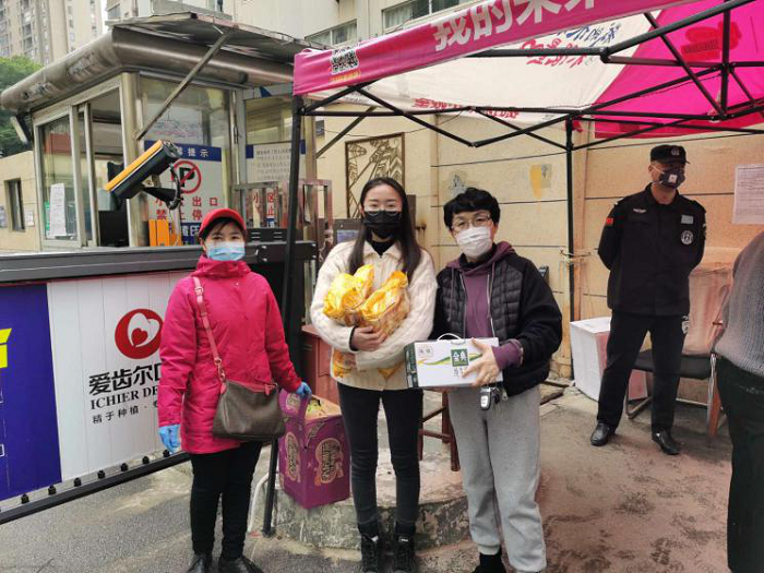 大约10点,两人再度奔赴第二站洪山区和平大道江南新天地C区,借着导航,空旷的大道,她们可谓畅通无阻。可是停下车来,这里设有几道关卡,好几次的电话和询问才弄清小区之门。这里的是食科一名女同学,家在云南,也是因为经济困难,寒假留于武汉兼职。这里封管甚严,只能隔卡相见。看到课堂上熟悉的脸庞瘦了,既为老师又是母亲的两人禁不住心酸。刘老师将生活物资递给学生,反复叮嘱学生照顾好自己,有困难及时联系,让学生记住学校是家,老师就是亲人。由于小区门口人略显密集,时间紧,两人稍作停顿,消消毒,又上路前行。
