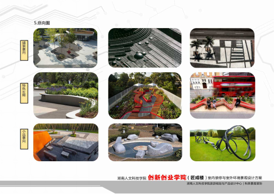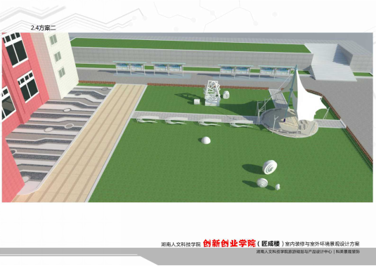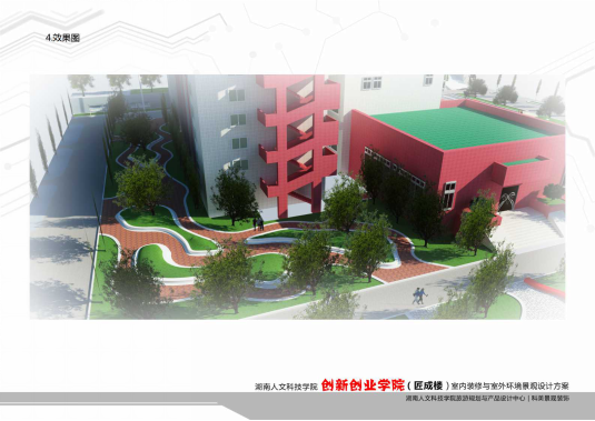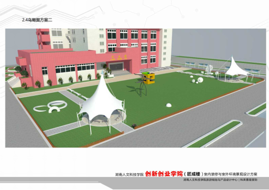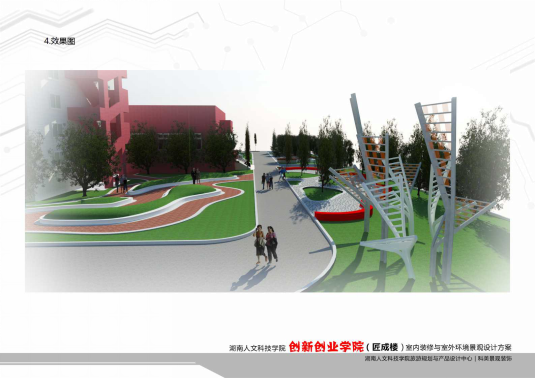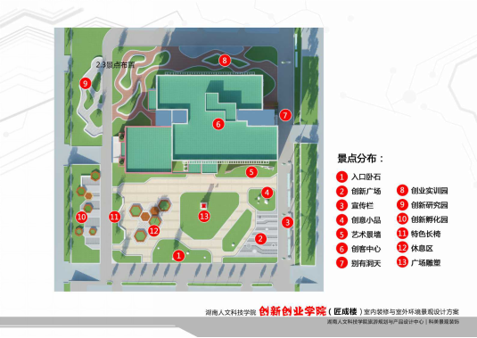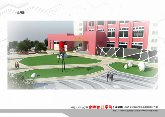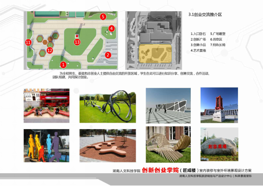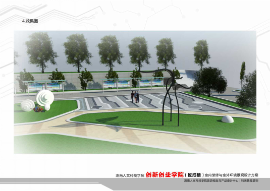 整体设计改造成创客广场,集地标、学习、交流等功能为一体的综合广场。结合创新创业基地的整体方案进行设计,形成该广场独特的青春、创造文化氛围,成为人文学子乐意聚集的创客文化广场。