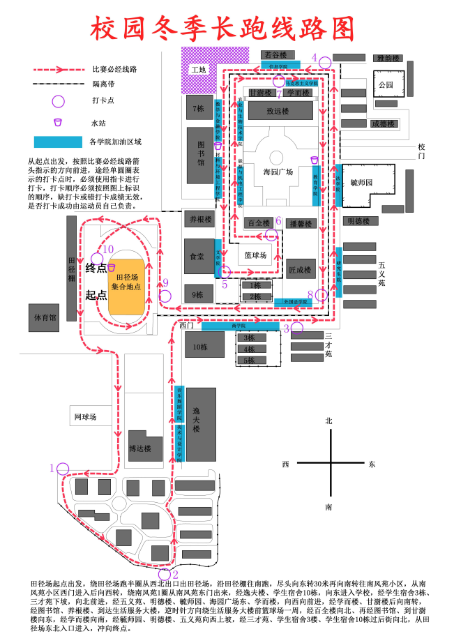 (三)比赛当日要求各学院安排30名以上的同学,按附图要求,在指定地点设立服务加油站,为运动员加油鼓劲、提供服务。