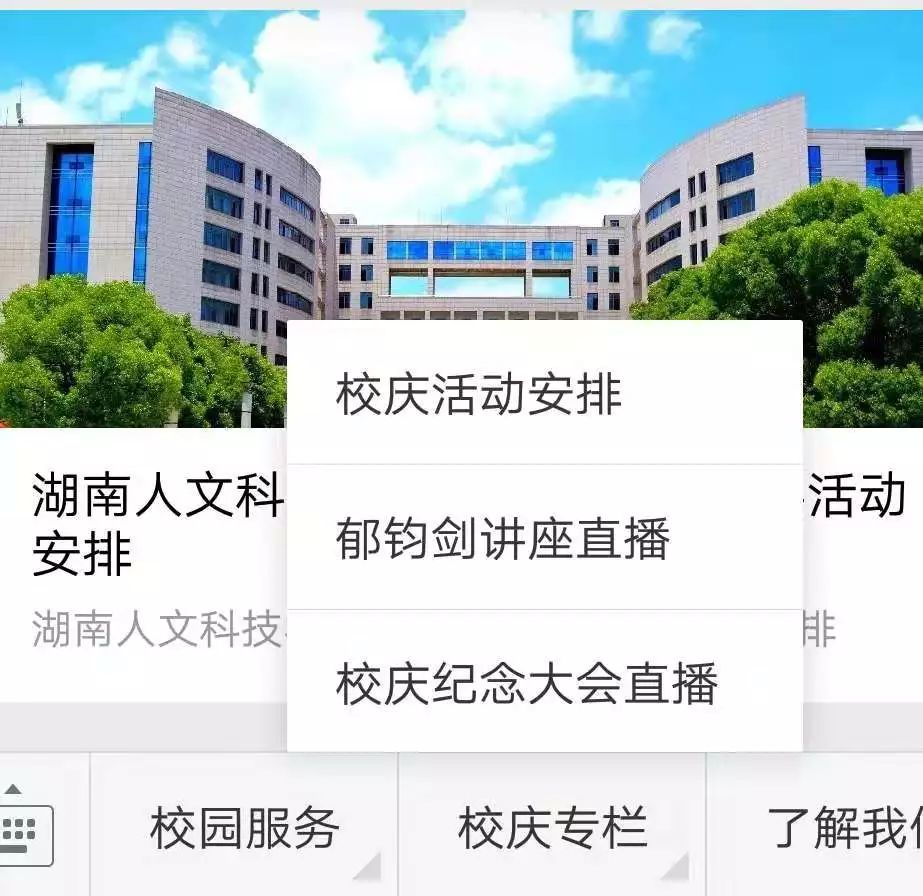 观看方式一:微信扫描官微二维码并关注,点击校庆活动菜单,点击郁钧剑讲座直播观看