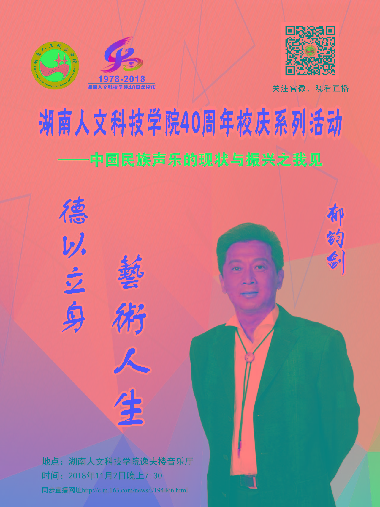为庆祝今年会四十华诞,特邀请著名歌唱家郁钧剑来今年会演讲,并将进行网络同步直播,敬请广大师生、校友和社会各界人士届时观看。现将具体时间安排和观看方式告知如下: