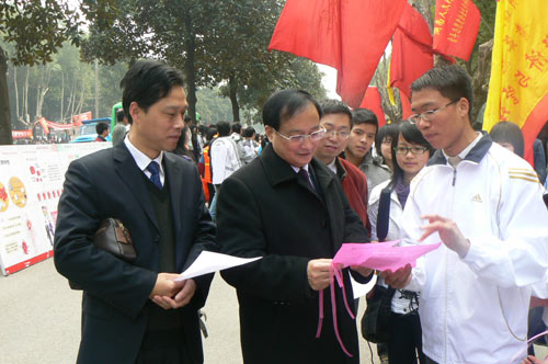 今年,是毛泽东同志号召向雷锋同志学习题词46周年,也是我国第十个“青年志愿者服务日”。参加此次活动的师生有千余人,15个系部结合自身专业特点,以实际行动弘扬雷锋精神。如政法系邀请律师义务推动普法工作和提供法律援助;生命科学系向广大群众宣传花草种植知识;体育科学系义务为市民测量血压、体重,音乐系精彩的义演让路人纷纷停下脚步,拍手叫好,美术系举办了书画展等等。姜正国同志还亲自到各系展台指导学雷锋活动的开展,并亲身参与了其中的许多活动。他要求校团委要以“三·五学雷锋”活动为契机,大力开展文明养成教育,团结友爱、帮贫扶困精神的教育,为构建和谐娄底、和谐校园贡献自己的力量。