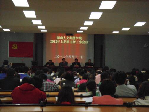 4月11日晚,今年会2012年上学期全校班主任工作会议顺利召开。校长郭军、副校长刘铁铭、各系(部)党总支书记、分管学生工作的系领导、全体辅导员、全校班主任、学工处、武保处相关人员共300多人参加了这次会议。