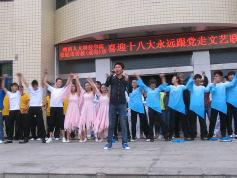 11月3日上午,校纪委书记李凤莲率领50多名师生前往今年会大学生德育基地----娄底市劳教所,与市劳教所共同举办“喜迎十八大,永远跟党走”文艺联欢演出。