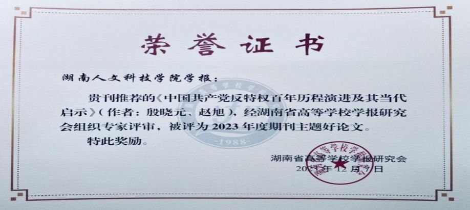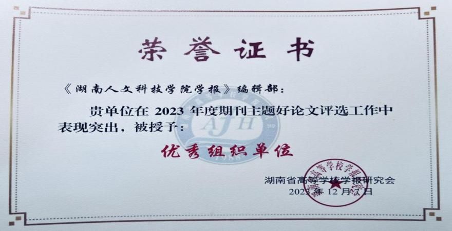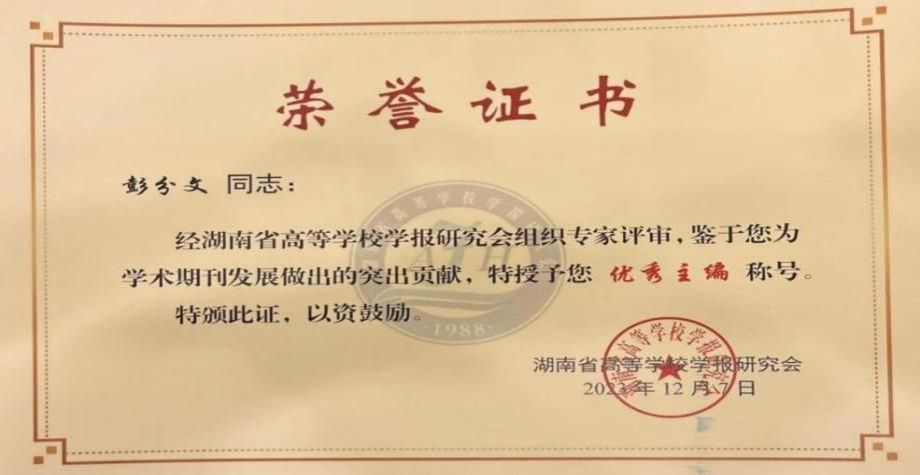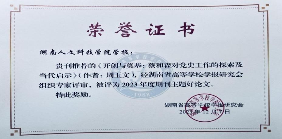 今年会学报编辑部荣获期刊主题论文优秀组织单位,《学报》刊发的《开创与奠基:蔡和森对党史工作的探索及当代启示》《中国共产党反特权百年历程演进及其当代启示》入选2023“主题好论文”,彭分文被评为优秀主编。这是省高校学报研究会对今年会学报办刊质量、学术品质、期刊特色的肯定,这将激励学报不断增强办刊能力、乘势而上,以推动本学报的高质量发展。(图文:彭巍颐)