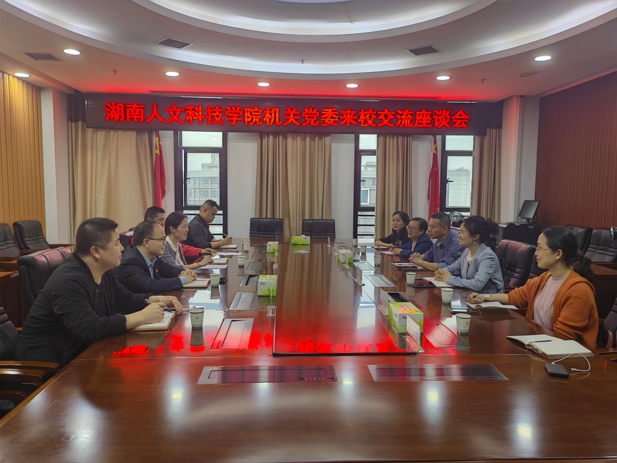 湖南文理学院在校组织了交流座谈会。湖南文理学院组织部常务副部长、机关党委书记李虹、组织部副部长李鹏、宣传统战部副部长袁勇军、工会副主席谢腾云等机关党委委员及组织部有关同志参加座谈会。在会上,双方就机关党委党支部日常管理、主题党日活动、三会一课、双述双评、支部考核制度、党员教育管理等方面的工作经验和创新举措进行了广泛交流,深入探讨了如何更好开展党员教育,如何更好将党建工作与事业发展相融合等问题。
