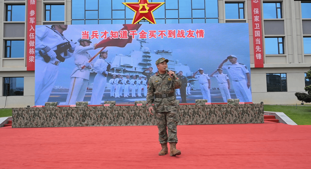 刘仲春老师指导整个策划过程,对每一个环节精益求精,力求每一个细节都能触动新兵及家人的心弦,激发他们的爱国热情和使命感。团队老师们充分发挥其在视觉传达设计、文化艺术、舞台编导等方面的专长,精心设计了一系列富有创意和情感深度的环节。从陆军第六届“四有”新时代革命军人标兵代表为新战友现场寄语,到新兵代表上台发表入伍感言,再到家属与新兵之间的温情互动,每一个环节都旨在强化新兵的身份认同,同时传递出社会对他们的崇高敬意和殷切期望。音乐舞蹈学院学生献唱的歌曲《好男儿就是要当兵》将大会推向高潮,激昂的旋律和振奋人心的歌唱激发了新兵们的热情和斗志,使他们感受到成为军人的光荣与自豪。