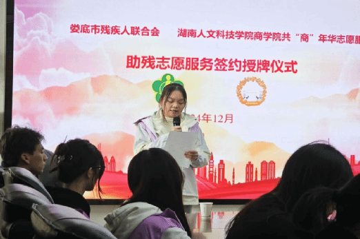 12月3日,一场意义非凡的助残志愿服务签约授牌仪式在娄底市残疾人联合会举行。娄底市残联党组成员、副理事长刘妍熙,娄底市残疾人服务中心副主任李祥,校团委副书记张莎莎、商学院团总支书记欧阳纯晶、辅导员刘佳瑶以及共“商”年华志愿服务队的志愿者代表共同参加仪式。