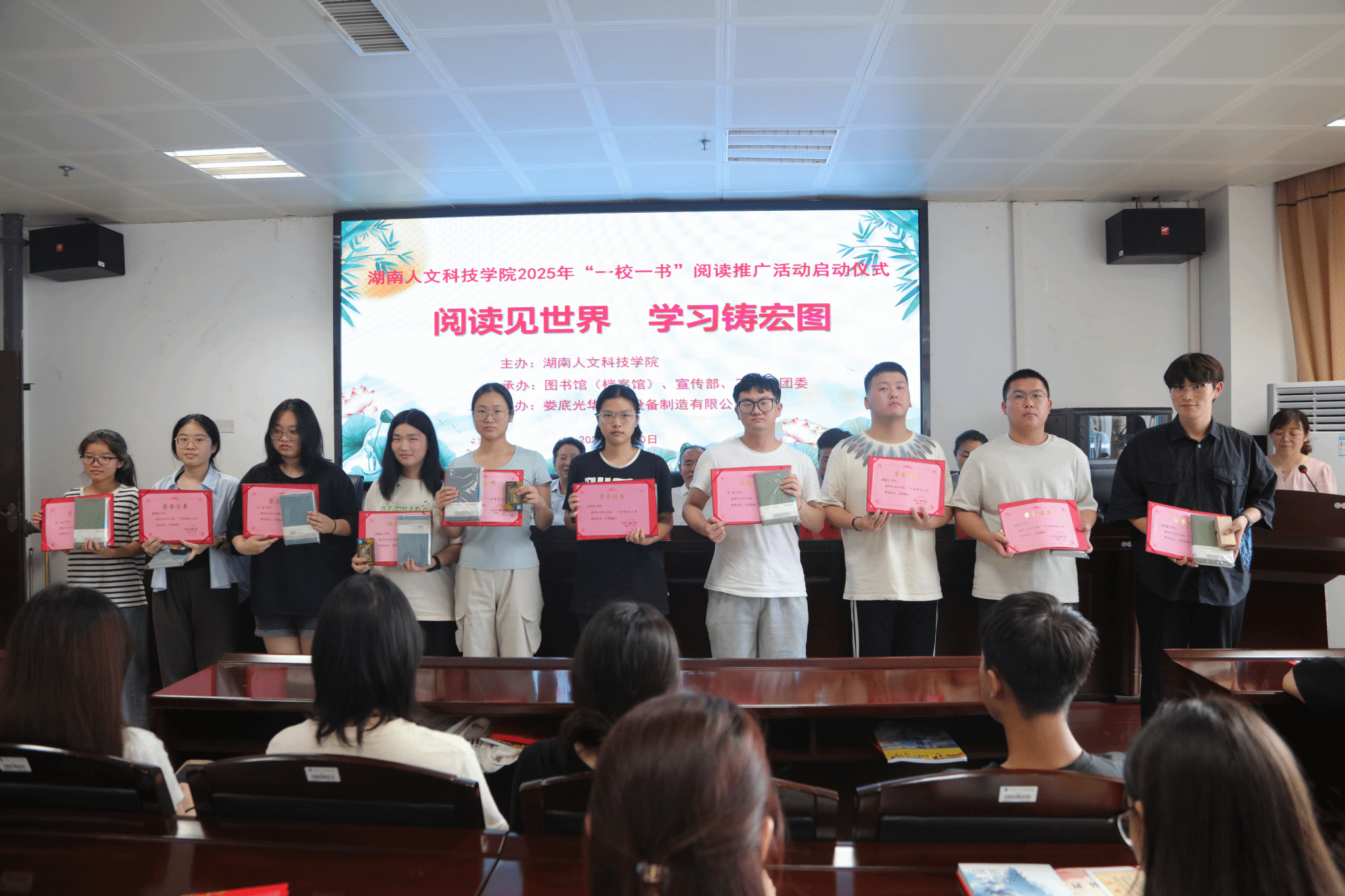 根据馆长和读者推荐,确定2025年精读图书为《习近平走进百姓家》和《平凡的世界》,以此两本书开展征文活动。会上,宣读了2024年“一校一书”阅读推广系列活动获奖名单,对获湖南省教育厅优秀读书报告奖的学生、学校“一校一书”阅读征文、第十届文学名著电影欣赏节影评书评征文、“十佳借阅之星”等获奖单位和个人进行了表彰。来自文学院2022级汉语言文学专业蒋建丰同学作为学生代表发言。