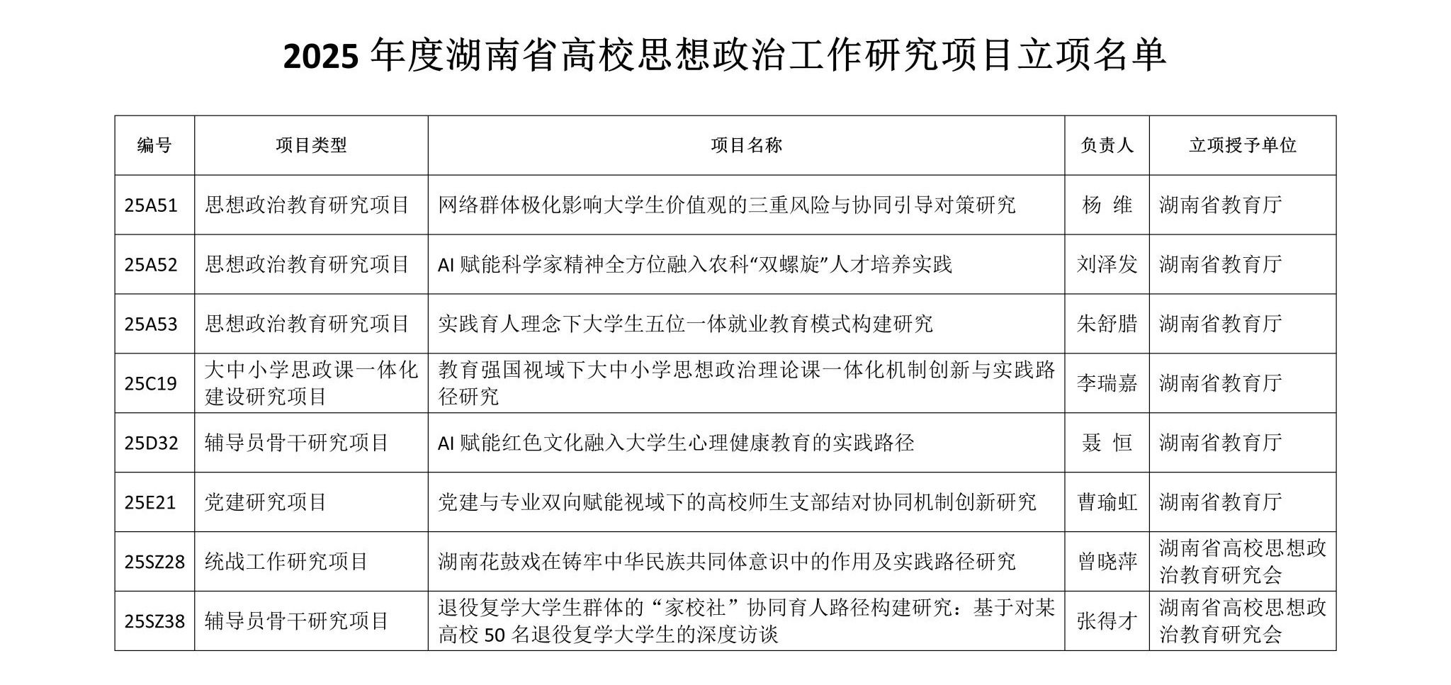获批项目立足思政工作实际,选题新颖、价值鲜明,紧密契合时代育人要求,在网络育人、实践育人、党建等方面有独特的思考和探索。如,《AI赋能科学家精神全方位融入农科“双螺旋”人才培养实践》,为农科人才培养提供数字化转型方案,助力培育兼具技术能力与科学家精神的知农爱农人才;《实践育人理念下大学生五位一体就业教育模式构建研究》将学科竞赛、创业就业竞赛、实训实践等五类资源融入就业教育,为高校优化就业教育体系、破解就业难题提供参考;《网络群体极化影响大学生价值观的三重风险与协同引导对策研究》,聚焦网络环境下思政教育新挑战,为应对网络环境下大学生价值观偏差、防范网络意识形态风险提供策略;《AI赋能红色文化融入大学生心理健康教育的实践路径》,探索红色文化与心理育人的融合新机制,拓展高校心理健康教育新思路;《党建与专业双向赋能视域下的高校师生支部结对协同机制创新研究》,创新支部联动机制破解党建与业务“两张皮”难题,为高校党建与业务融合提供可推广的操作范式;《教育强国视域下大中小学思想政治理论课一体化机制创新与实践路径研究》,为构建循序渐进、螺旋上升的思政课体系提供科学路径,助力思政教育学段贯通。《湖南花鼓戏在铸牢中华民族共同体意识中的作用及实践路径研究》,挖掘地方戏曲文化价值与共同体意识的内在联结,为传统文化赋能民族凝聚提供创新思路;《退役复学大学生群体的“家校社”协同育人路径构建研究:基于对某高校50名退役复学大学生的深度访谈》,聚焦特殊群体成长需求,为完善协同育人机制、助力退役复学大学生全面发展提供实践参考。