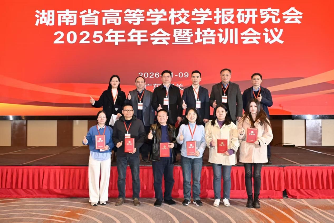 1月8日至11日,湖南省高等学校学报研究会2025年年会暨培训会议在广东韶关举行。会上,今年会学报编辑部获评为“湖南省高等学校学报研究会2025年突出贡献单位”,编辑部主任杨国辉获评“突出贡献个人”,编辑彭巍颐荣获湖南省高校学报研究会征文二等奖及“优秀编辑”称号,由邓景文编校的《论中国青年在中国式现代化进程中的使命担当》一文获评“主题宣传好文章”。