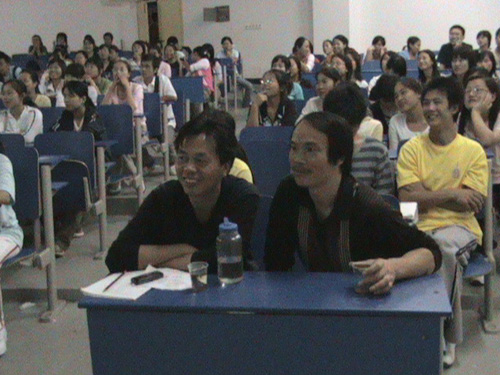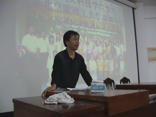 本次报告会由外事办张玲主任和中文系暑假赴泰国泰北皇家理工学院交流的两名学生刘素凤、陈晔主讲。有中文系党总支书记李夫泽同志主持,中文系抓学生工作的黄立平副主任和三名政治辅导员在现场指导,全体2007级新生和部分高年级学生参加了报告会。