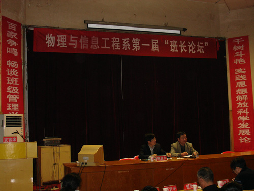3月31日下午2:30,物理与信息工程系第一届“班长论坛”在图书馆报告厅举行。论坛由该系主任陈昌永教授主持,校学工处处长谢光绎、系党总支书记谢常清及全系老师作为嘉宾应邀出席,06级到08级的各班同学参加了本次论坛。本次活动由物理系学生会、团总支共同举办。