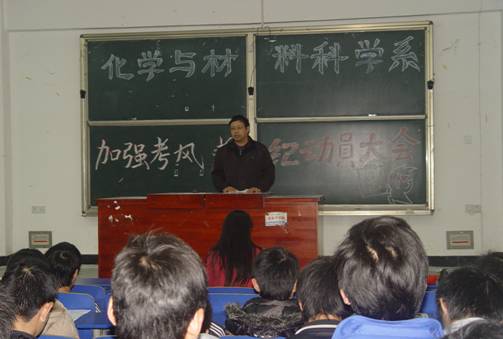会上,系党总支余为书记就加强考风考纪对学生进行了教育和总动员,他指出,诚信是做人之本,是一个人最基本的素质,而大学是培养诚信的最重要的阶段,“诚信立学、诚信立身、诚信立行”应该成为当代大学生的行为准则。他勉励同学们要发扬化学与材料科学系的优良传统,加强自我修养,坚决抵住考试中的不良风气,用扎实的知识、坚强的意志、求真的态度,诚信为人,诚信应考,向自己、向学校交出满意的答卷。李家其副主任强调了严肃考风考纪、诚信考试的重要性,对诚信应考作出了具体要求。