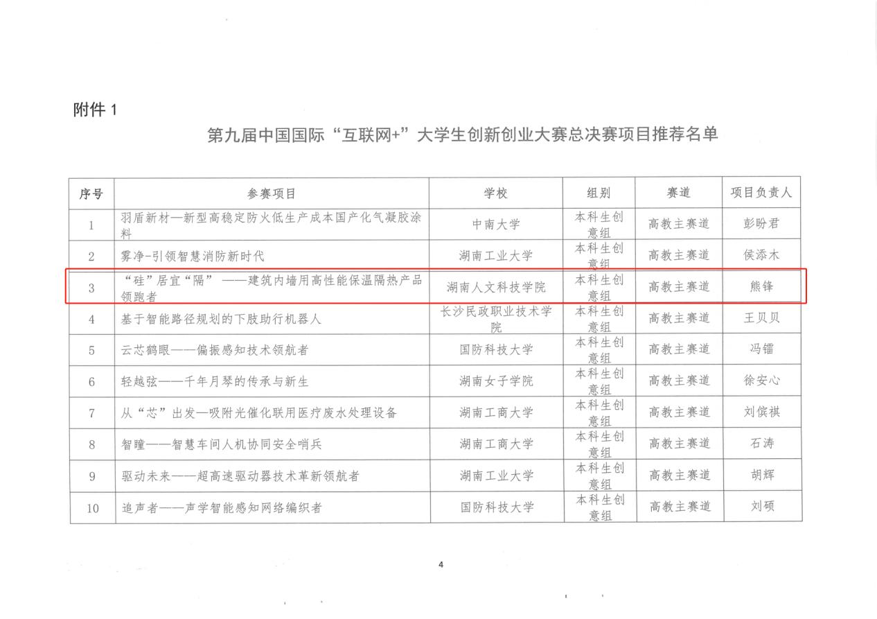 近日,“建行杯”第九届湖南省“互联网+”大学生创新创业大赛省赛在湖南工业大学圆满落幕。今年会本科生创意组《“硅”居宜“隔”——建筑内墙用高性能保温隔热产品领跑者》项目获得高校主赛道省级一等奖,与研究生创意组《流体利刃——世界领先五轴联动智能水刀》项目双双挺进国赛。此外,今年会另有7个项目获得高校主赛道省级三等奖,刷新历史最好成绩。