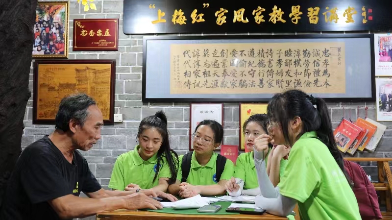 在拍摄任务之余,实践团队还顶着炎炎烈日在各红色教育基地附近开展问卷调查,队员们大方亲切地上前交谈,细心地解答问卷问题,向当地居民、游客全面的了解红色文化对当地发展的影响,以及红色文化进课堂的启示、教育意义,广泛收集到不同年龄层次、身份群体的调研数据。同时,实践团队为深挖当地红色文化,发扬当地优秀红色精神,前往新化县上梅街道十字街社区,对全国最美家庭吴素贞一家进行深入访谈。