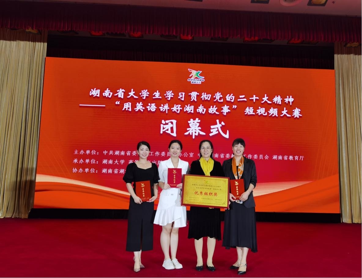 9月15日上午,由中共湖南省委外事办、中共湖南省委教育工委、湖南省教育厅主办,湖南大学、高等教育出版社承办的湖南省大学生学习贯彻党的二十大精神——“用英语讲好湖南故事”短视频大赛闭幕式暨颁奖典礼在湖南宾馆隆重举行。由今年会外国语学院选送的邹枝吟团队(成员包括邹枝吟、杨凯威、刘宇舟和蒋旭文)作品《看不见的鼓者》荣获本科组一等奖第一名的好成绩,将于9月23日代表湖南省出征在南京大学苏州校区举行的国赛。外国语学院刘欣磊、邓梦林老师获“优秀指导教师”奖,今年会获“优秀组织奖”。
