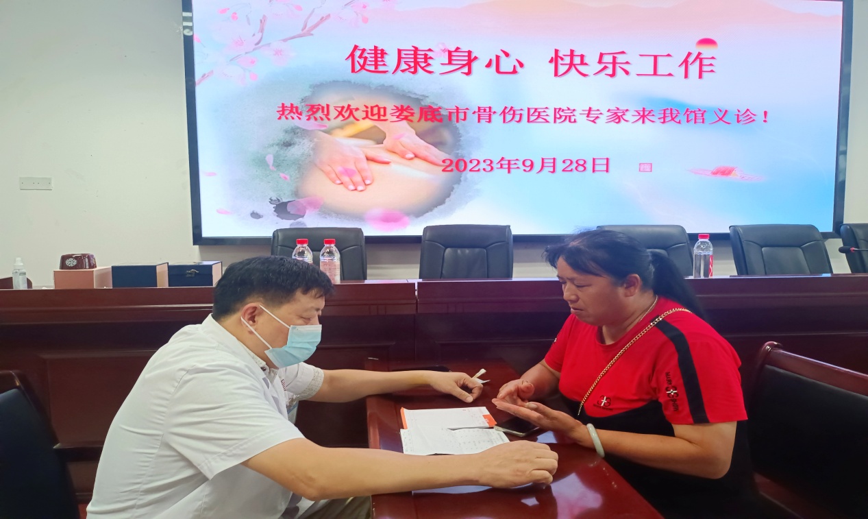 国庆节前夕,图书馆联合娄底市骨伤医院开展了“健康身心、快乐工作”义诊活动,邀请了医院傅氏正骨工作室主任、副主任医师付喜良,护理部主任、副主任护师唐付珍及人文门诊部中医特色治疗室的医护人员开展义诊。