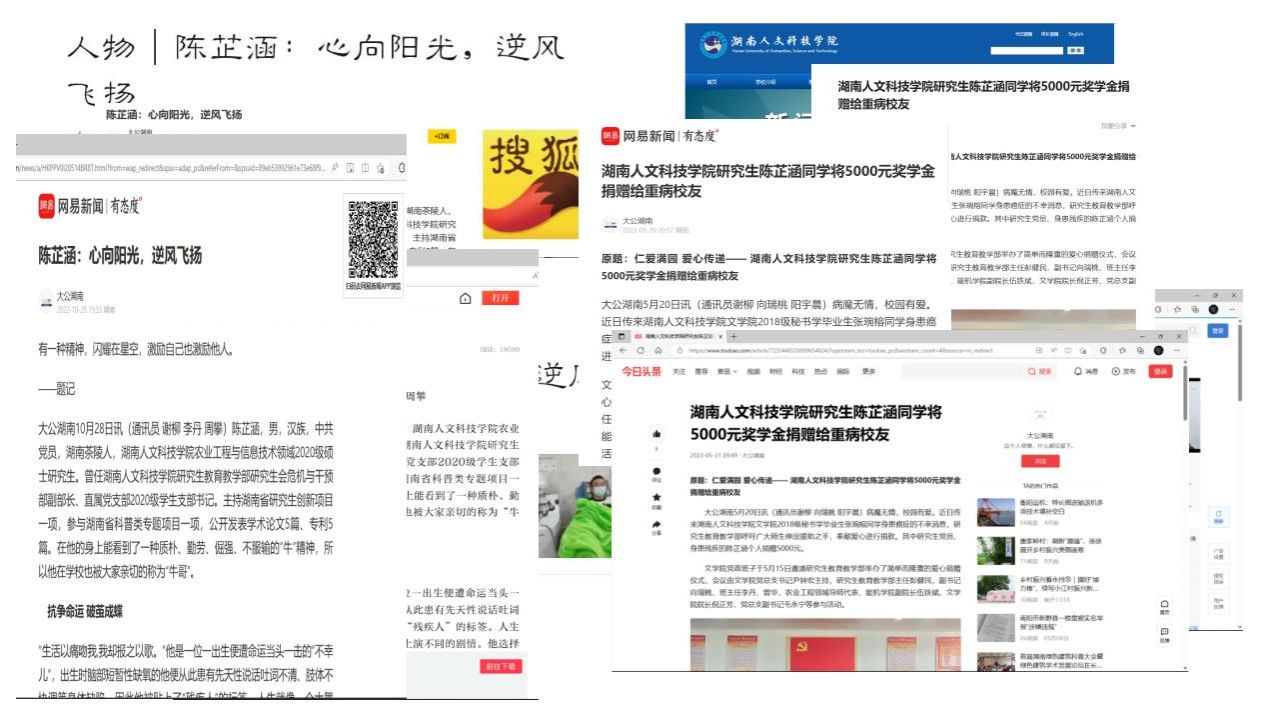 陈芷涵患有先天性吐词不清、肢体不协调等,但他以坚韧不拔的心性、乐于奉献的品质和追求卓越的精神,在专业学习、科学研究、学科竞赛、志愿者服务等方面取得突出成绩,成为今年会研究生党员中的杰出代表,获得了“2023年度湖南省普通高校优秀大学生党员”、“第十七届湖南省芙蓉学子道德风尚奖”等荣誉。