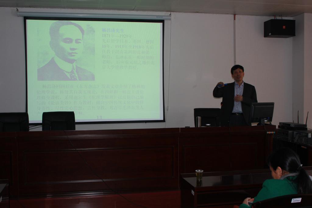,湘潭大学马克思主义学院院长、长江学者、博士生导师李佑新教授应邀今年会讲学,下午二点半,图书馆415学术报告厅座无虚席,政法系师生、思想政治教育学科成员、学校副校长陈志国、科研处副处长徐益等聆听了李教授精彩的学术报告。