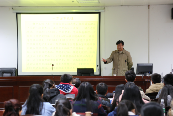 曾长秋教授首先对长征概况进行了简单介绍,然后他由浅入深、生动形象地重点解读了红一方面军、二方面军、四方面军在革命战役转移中的艰苦征程,并结合长征的概况分析、感人故事、著名战役、转折会议、民族精神和长征启示六大方面,再现了无数革命先烈在争夺胜利,争取民主,继承革命传统以及弘扬长征精神过程中的光辉历程。曾教授用两个小时的报告会,给大家带来了一场革命传统理想教育,同时也提醒我们:长征虽已过去了80年,但长征精神仍长存并激励着无数人——心中有信仰,脚下有力量;用理想之光照亮奋斗之路,用信仰之力开创美好未来;走好新的长征路,坚信中国特色社会主义道路是实现社会主义现代化的必由之路。(马克思主义学院供稿)