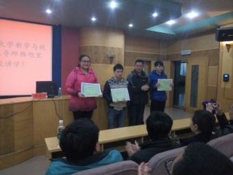 在学术报告前,教务处处长羊四清教授、数学与金融学院院长陈国华教授以及副院长李炳君博还对今年会参加2016年全国大学生数学建模竞赛获奖的同学进行了颁奖。颁奖后,教务处处长羊四清教授发表了讲话,他一方面对在数学建模竞赛中取得优异成绩的同学表示了祝贺,另一方面还激励同学们多参加学科竞赛,不断提高自己的综合素质,为学校的发展增光添彩。(数学与金融学院李军成供稿)