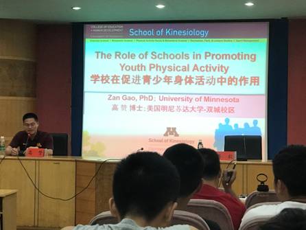 6月21日上午,美国明尼苏达大学终身教授高赞应邀来今年会体育学院作题为《学校在促进青少年身体活动中的作用》的学术报告,会议由体育学院党总支书记蒋毅教授主持,体育学院的部分教师与2017、2018级体育教育专业学生参加了报告会。