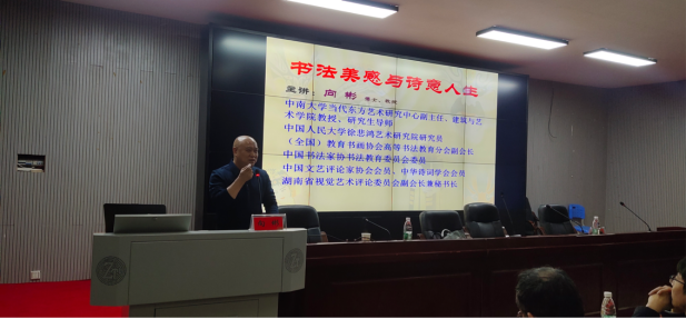 11月24日下午,应科研处和美术与设计学院邀请,中南大学书法学教授向彬博士做客“人文科技大讲坛”,在逸美楼报告厅作了题为“书法美感与诗意人生”的学术讲座。美设院书法学部分师生150余人聆听讲座,讲座由美设学院党总支书记谢光绎主持。