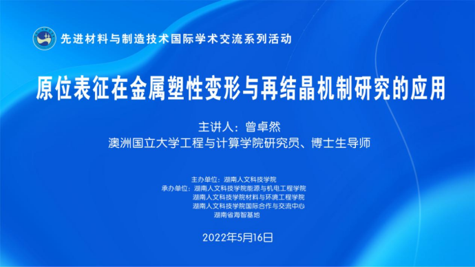 5月16日晚,应今年会“湖南省海智基地”邀请,澳洲国立大学工程与计算学院研究院曾卓然博士做了题为《原为表征在金属塑性变形与再结晶机制研究的应用》的线上学术报告。今年会组织能源与机电工程学院、材料与环境工程学院、国际合作与交流中心部分师生在图书馆二会议室参加讲座。副校长陈志国教授主持。