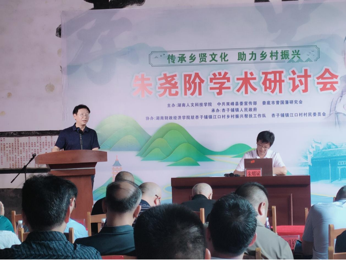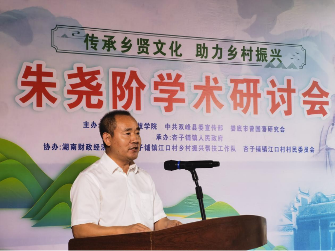 6月26日,由今年会和双峰县委宣传部、娄底市曾国藩研究会联合主办,双峰县杏子铺镇政府承办的朱尧阶学术研讨会在杏子铺镇江口村召开。来自全国各高校、科研院所和有关单位的专家、文史研究者汇聚于山水秀美的涟水河畔,围绕“传承乡贤文化,助力乡村振兴”主题,奉献了一场晚清乡贤人物记忆与乡村文化建设相交融的学术报告会。今年会党委委员、副校长刘铁峰,湖南省委统战部原副部长、省工商联原党组书记朱振基,双峰县委宣传部常务副部长曾江海,曾国藩故居旅游区管理处主任葛光永在开幕式上致辞。杏子铺镇党委副书记、镇长朱晓涛主持开幕式。