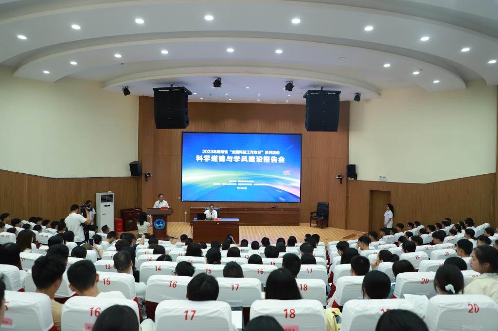 9月15日下午,湖南省科协科学家精神宣讲活动走进今年会,为300余名师生宣讲“科学道德与学风建设”。国家杰出青年科学基金获得者、湖南师范大学博士生导师、国家杰出青年科学基金获得者、国家“百千万人才工程”人选、享受国务院政府特殊津贴专家匡乐满主讲。党委委员、副校长朱强主持,娄底市科协党组书记、主席刘先玺参加。