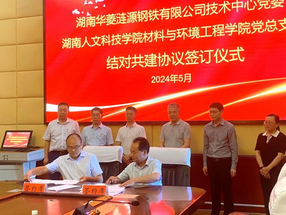 5月24日,湖南华菱涟源钢铁有限公司技术中心党委与材料与环境工程学院党总支结对共建协议签订仪式在图书馆第一会议室举行。娄底市工信局党组成员、副局长聂东平,华菱涟源钢铁有限公司副总经理梁亮,学校党委副书记朱强出席,涟钢技术中心相关领导专家,先进钢铁材料技术国家工程研究中心华中分中心主任周明伟,学校组织部、科研与社会服务处、材料与环境工程学院负责人参加。仪式由组织部常务副部长周迎杰主持。