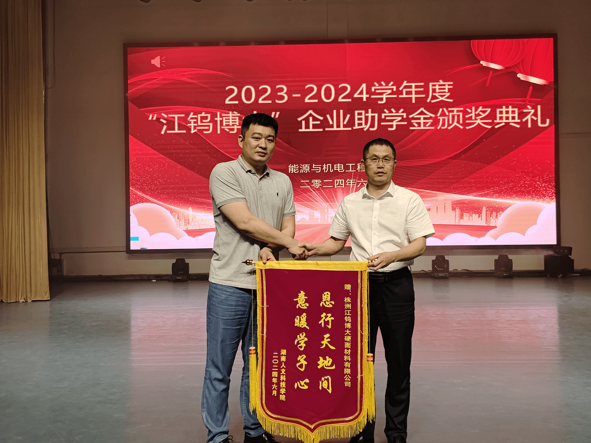颁奖典礼上,陈勇首先为株洲江钨博大硬面材料有限公司颁发锦旗。随后,石海宣读了2023-2024学年能源与机电工程学院企业助学金表彰文件,马遥、陈勇、魏彦煜、胡东为获得资助的30名品学兼优的贫困学生颁奖并与他们亲切交流。