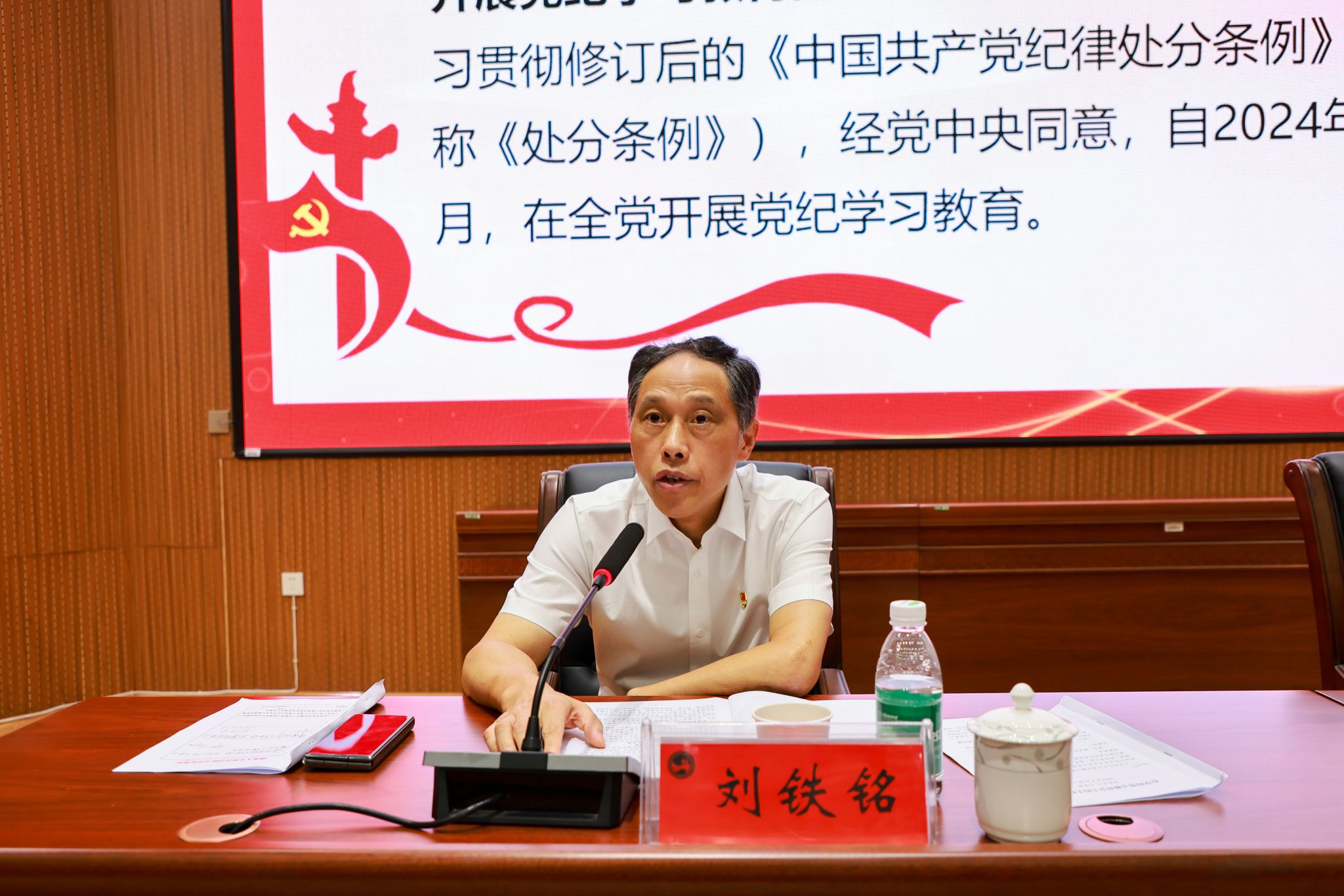 刘铁铭主要围绕《处分条例》的背景、重要意义和主要内容等方面,结合发生在身边的典型案例进行了深入浅出地解读。他强调要提高政治站位,原原本本学《处分条例》,将党的各项纪律规定内化于心,外化于行。要对照政治纪律看忠诚、对照组织纪律看党性、对照廉洁纪律看清廉、对照群众纪律看立场、对照工作纪律看担当、对照生活纪律看操守,进一步学纪、知纪、明纪、守纪,真正把纪律规矩转化为政治自觉、思想自觉、行动自觉。