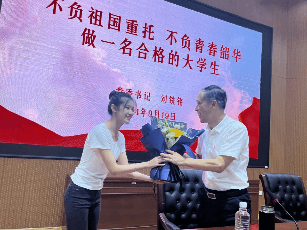 讲座后,新生代表向刘铁铭献上了鲜花,刘铁铭向新生代表赠送了“不负韶华”主题的开学文创礼品。现场气氛热烈,掌声不断。