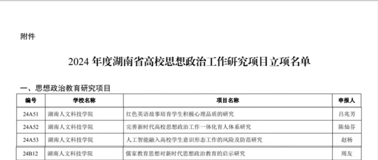 近日,中共湖南省委教育工委与湖南省教育厅公布了2024年度全省高校思想政治工作研究项目立项名单。今年会获批4项高校思政工作研究项目。