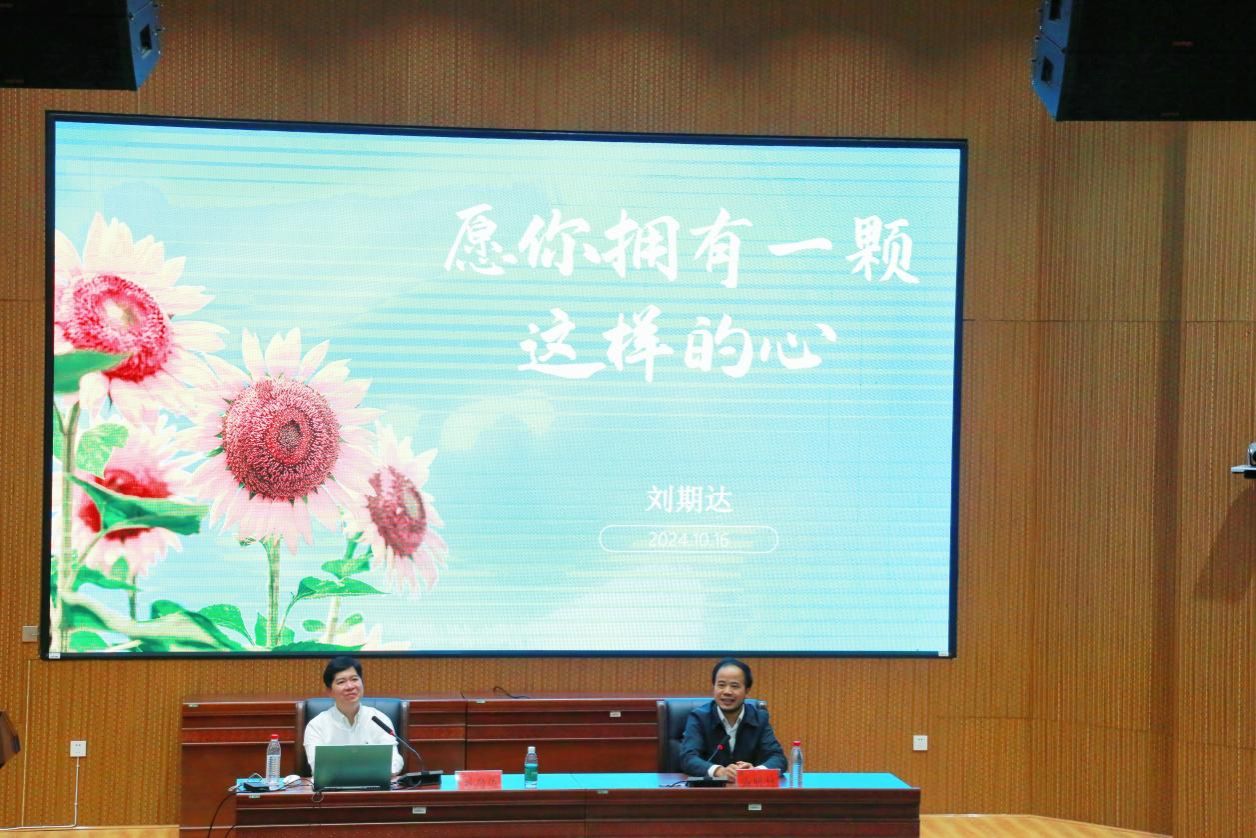10月16日下午,湘潭大学刘期达老师在匠成楼报告厅作“愿你拥有这样一颗心”生命教育主题讲座。校党委副书记、校长盛明科出席,湘潭大学土木工程学院党委副书记欧阳巍,今年会团委和各学院团总支相关老师与300余名团校学员一起参加讲座。