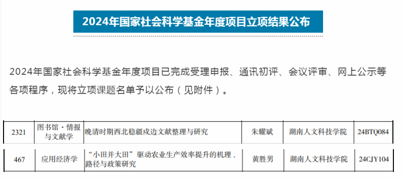 近日,全国哲学社会科学工作办公室正式公布了2024年国家社会科学基金项目立项名单,今年会法学院院长朱耀斌教授主持的《晚清时期西北稳疆戍边文献整理与研究》项目获一般基金项目资助,商学院黄胜男老师主持的《“小田并大田”驱动农业生产效率提升的机理、路径与政策研究》项目获批青年基金项目资助。