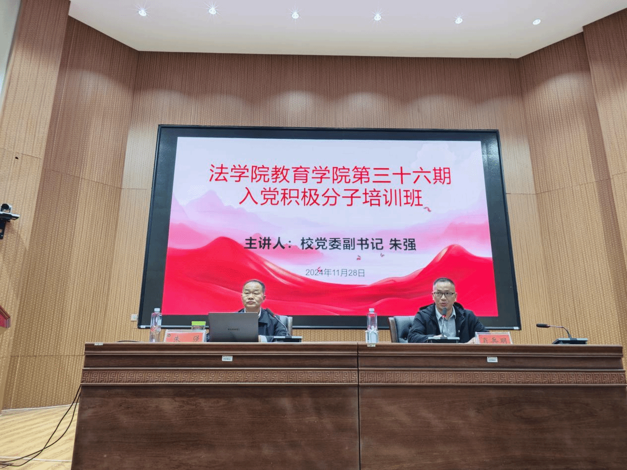 11月28日晚,学校党委副书记朱强教授在匠成楼为法学院、教育学院第36期入党积极分子共133人授课。法学院、教育学院学工队伍全体人员参加,法学院党总支书记肖兵明主持。