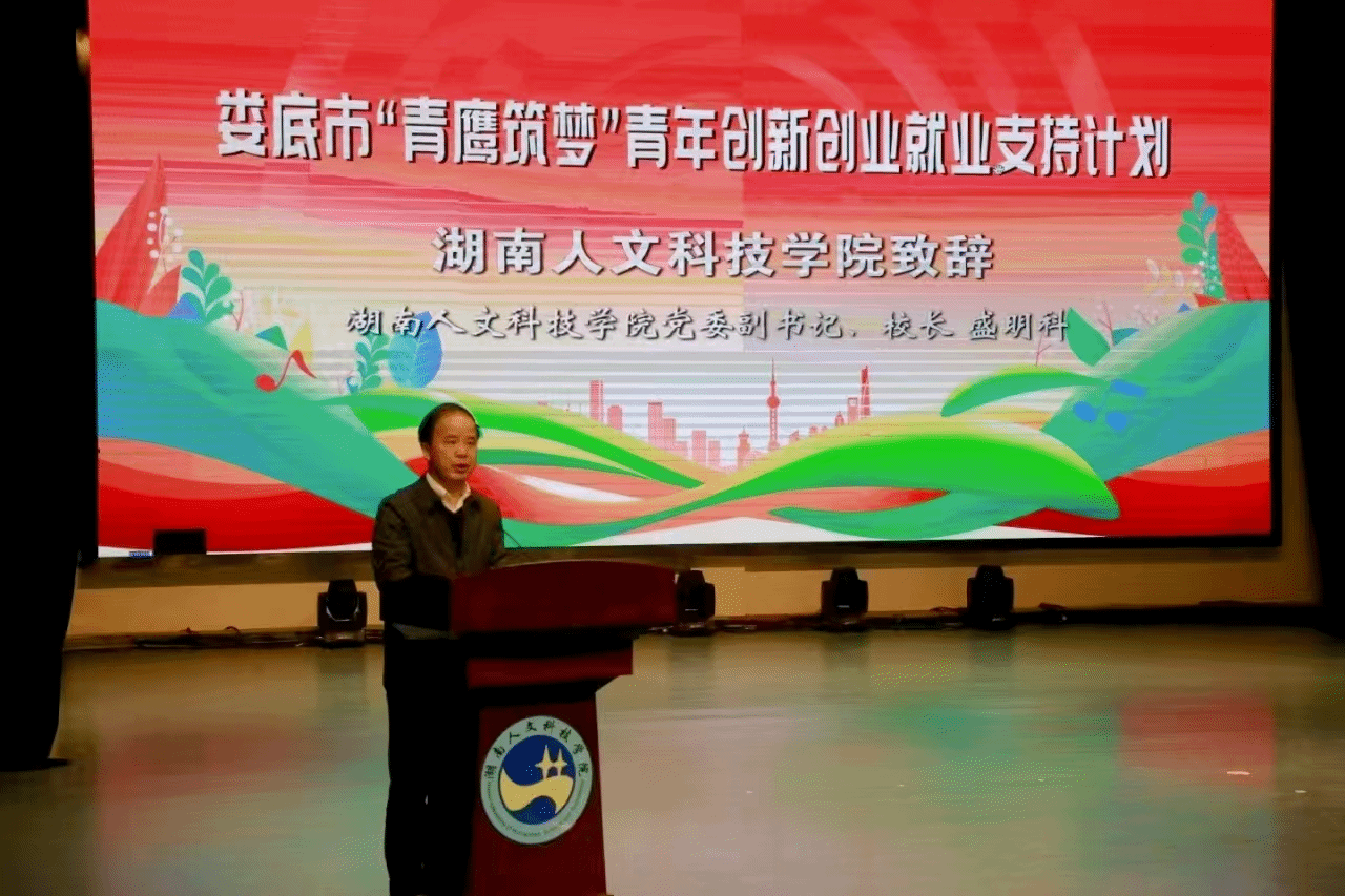 11月27日,娄底市“青鹰筑梦”青年创新创业就业支持计划“大学生创新创业大讲堂”示范性宣讲活动在今年会匠成楼报告厅举行。娄底市委副书记、市委政法委书记蒋天海,学校党委副书记、校长盛明科,党委委员、副校长谭峰亮出席活动。