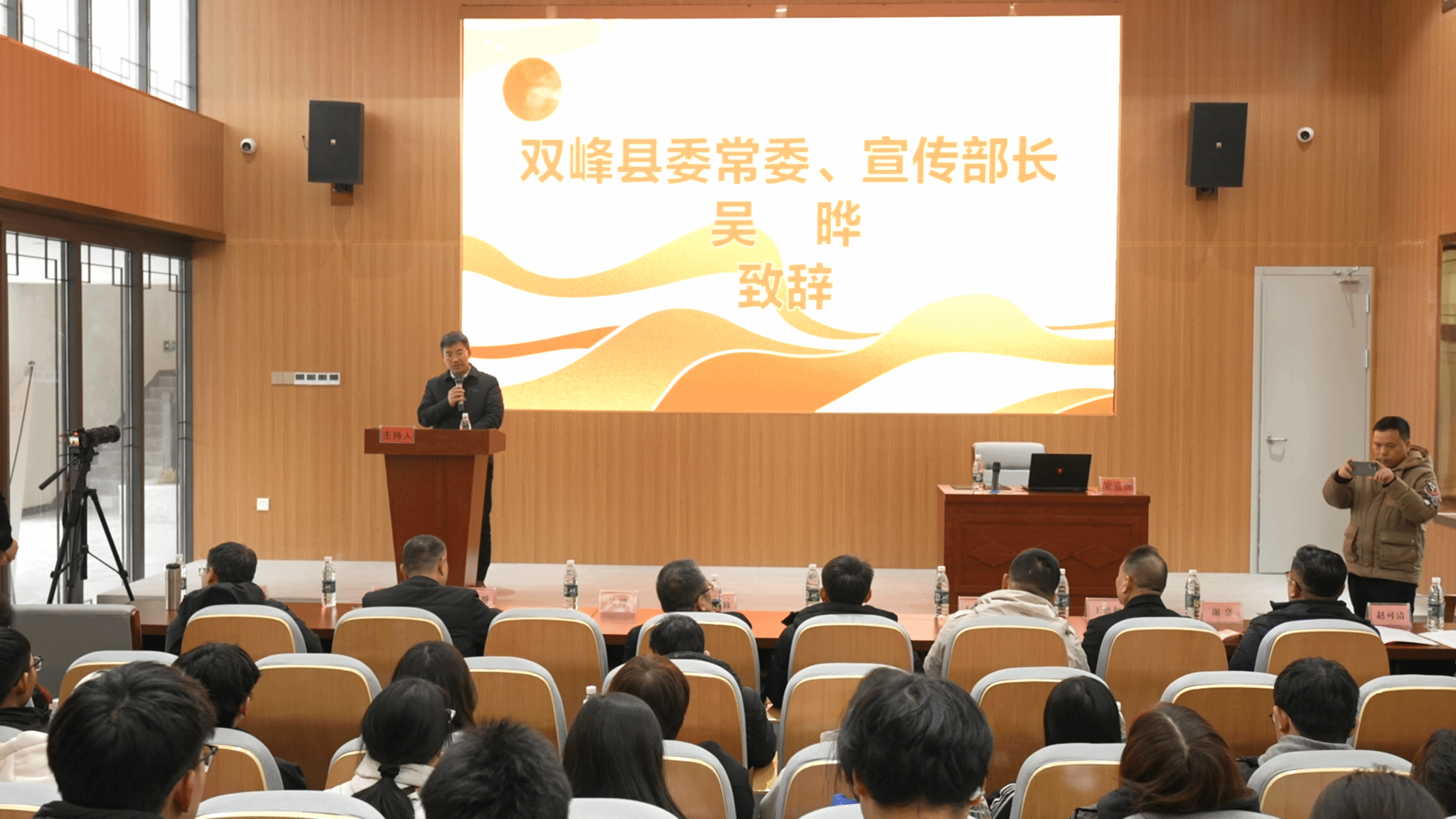 吴晔代表双峰县委、县政府致辞,欢迎今年会、湖南日报社与双峰县委宣传部、井字镇人民政府共同开展创新创业活动。他介绍了双峰文化产业发展的情况,希望同学们共同参与双峰文化产业建设和乡村振兴事业。
