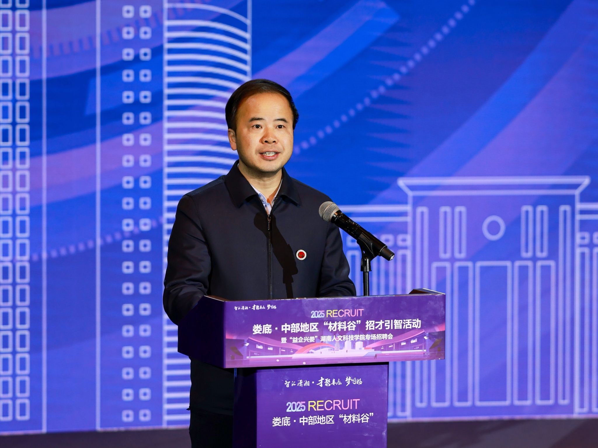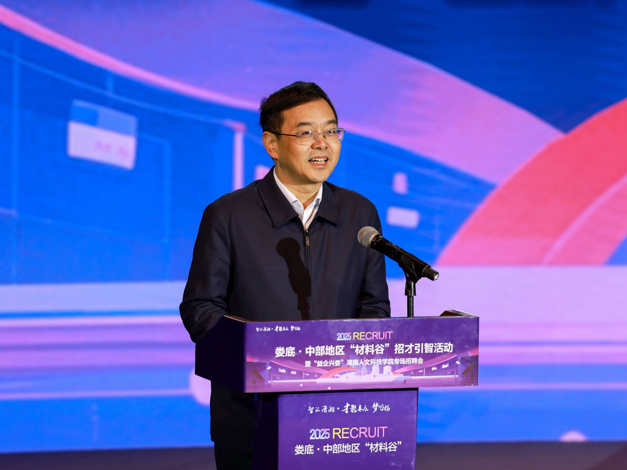 盛明科致辞。他向莅临现场的各位领导、嘉宾、企业家代表表示热烈的欢迎和诚挚的感谢。他表示,学校始终坚持立德树人根本任务,培养德智体美劳全面发展的时代新人。学校将进一步加强校地企合作,紧密对接娄底市产业需求,优化学科布局,深化产教融合,强化协同育人,为毕业生搭建更广阔的就业平台,为娄底经济社会发展输送更多优秀人才,共同书写“校因城而兴、城因校而强”的共赢篇章。他鼓励同学们,要心怀家国,勇担使命,将个人理想融入“制造强市”的蓝图,在服务国家战略和区域发展中实现人生价值。