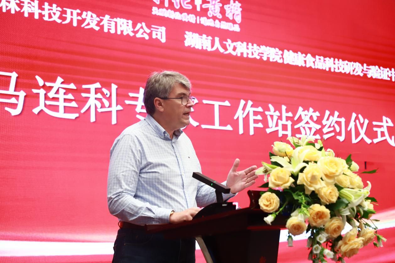 在签约仪式上,朱强表示,作为娄底市唯一的省属本科高校,学校始终坚持"以贡献求支持、以服务求发展"的办学理念,积极响应新化县委县政府助力乡村振兴的发展要求。他指出,从2021年组建湖南省先进陶瓷材料现代产业学院,到与新化茶叶协会开展深度合作,从三区人才计划项目到科技特派员挂职锻炼,今年会与新化县的合作不断深化。他强调,此次企业与国家级高层次人才马连科教授团队合作,是学校践行"把论文写在祖国大地上"的又一重要实践。学校将整合农业与生物技术学院、健康食品科技研发与验证中心等优势资源,全力构建"技术研发——成果转化——产业孵化"的全链条服务体系,为新化黄精产业注入强劲动能,并期待通过这次合作将新化黄精打造成为全国地标产品深加工和特色农业产业发展的新标杆。