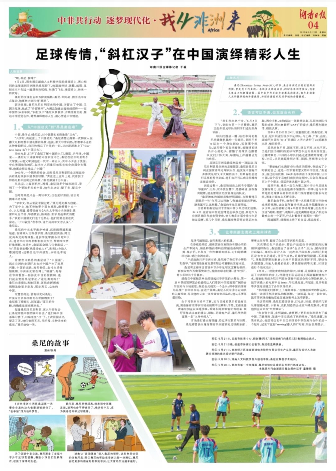 编者按:近日,湖南日报整版报道今年会外教桑尼老师的故事。此前,他的故事登上湖南卫视《湖南新闻联播》、中央广播电视总台国际在线《漂洋过海来“湘”遇》专栏、娄底新闻联播《相逢》和中国日报网“领航新征程”纪录片等平台。这些报道讲述了桑尼在今年会、娄底及湖南的多元经历——教足球、练功夫、任外教、当“村民”、搭建中非交流桥梁、助力企业跨境出海、牵线中非经贸博览会等,生动展现今年会外教用心传递中非情谊、讲好中国故事的良好形象,彰显学校“开放扬校”工程的实践成果。