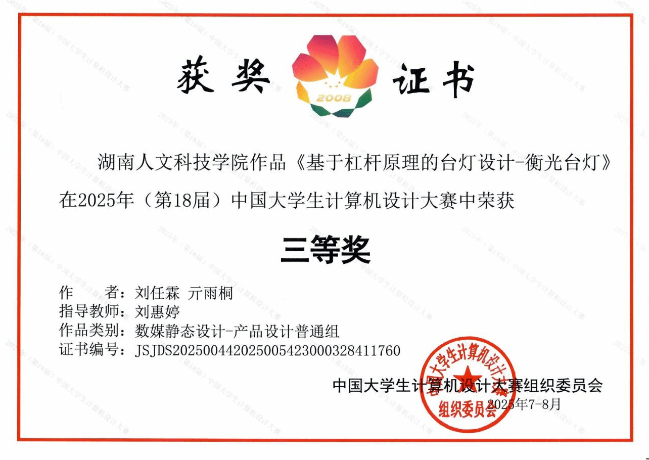 7月22日至26日,由中国大学生计算机设计大赛组织委员会主办的第18届中国大学生计算机设计大赛全国总决赛(微课与AI辅助教学与静态数媒设计赛道)在南京大学举行。今年会法学院刘任霖、亓雨桐团队作品《基于杠杆原理的台灯设计——衡光台灯》(指导教师:刘惠婷)荣获静态数媒设计组全国三等奖。