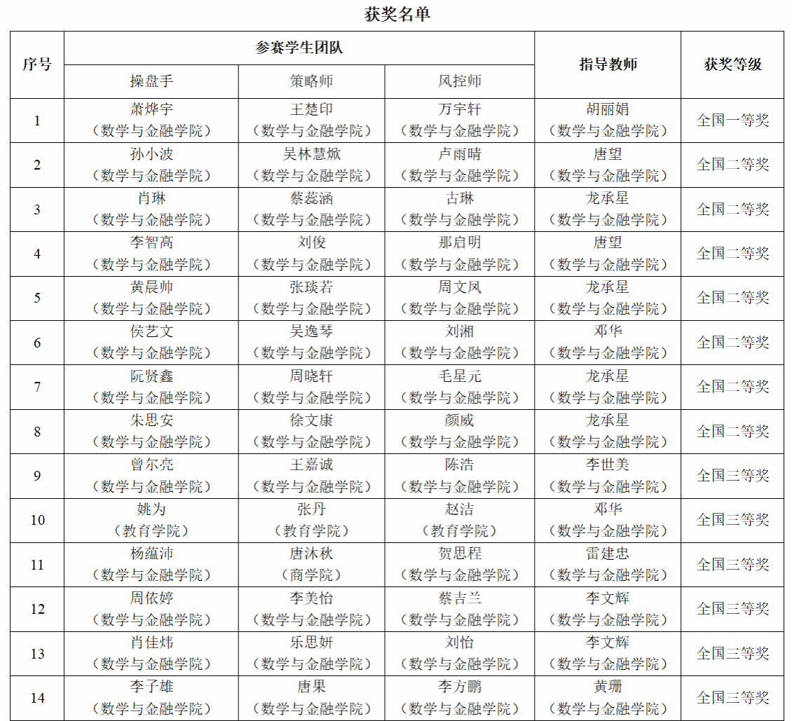 全国大学生金融挑战赛是一项具有高知名度、高含金量和广泛社会影响力的金融创新实践大赛。自本届赛事启动以来,在校团委、教务处以及各二级学院的支持下,数学与金融学院金融挑战赛指导教师团队面向全校选拔并组织506名学生参加校赛,经多轮比拼,49支队伍成功晋级省赛,最终25支队伍挺进国赛。备赛期间,指导教师围绕股票基础知识、实盘操作、投资定位、策略优化与风险控制等模块开展系统性培训,助力学生全面提升金融创新实践能力。